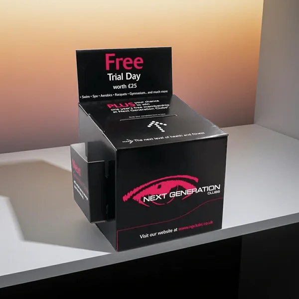 Branded ballot display boxes create a sense of involvement and encourage spontaneous engagement, particularly in retail and event environments.